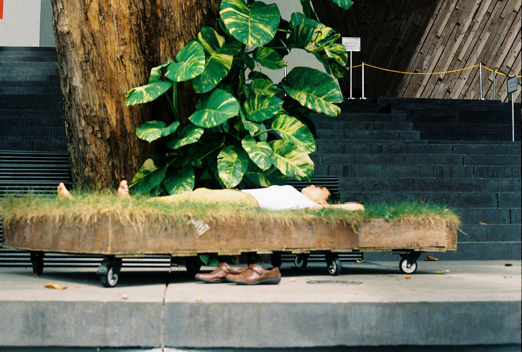 Rest in Peace is a mobile grass bed situated in a city thoroughfare, inviting members of the public to take pause on an island of grass. It facilitated conversations about self-care, the healing powers of nature and solitude. A deinstallation ceremony was held where the grass was repotted and given out to strangers.